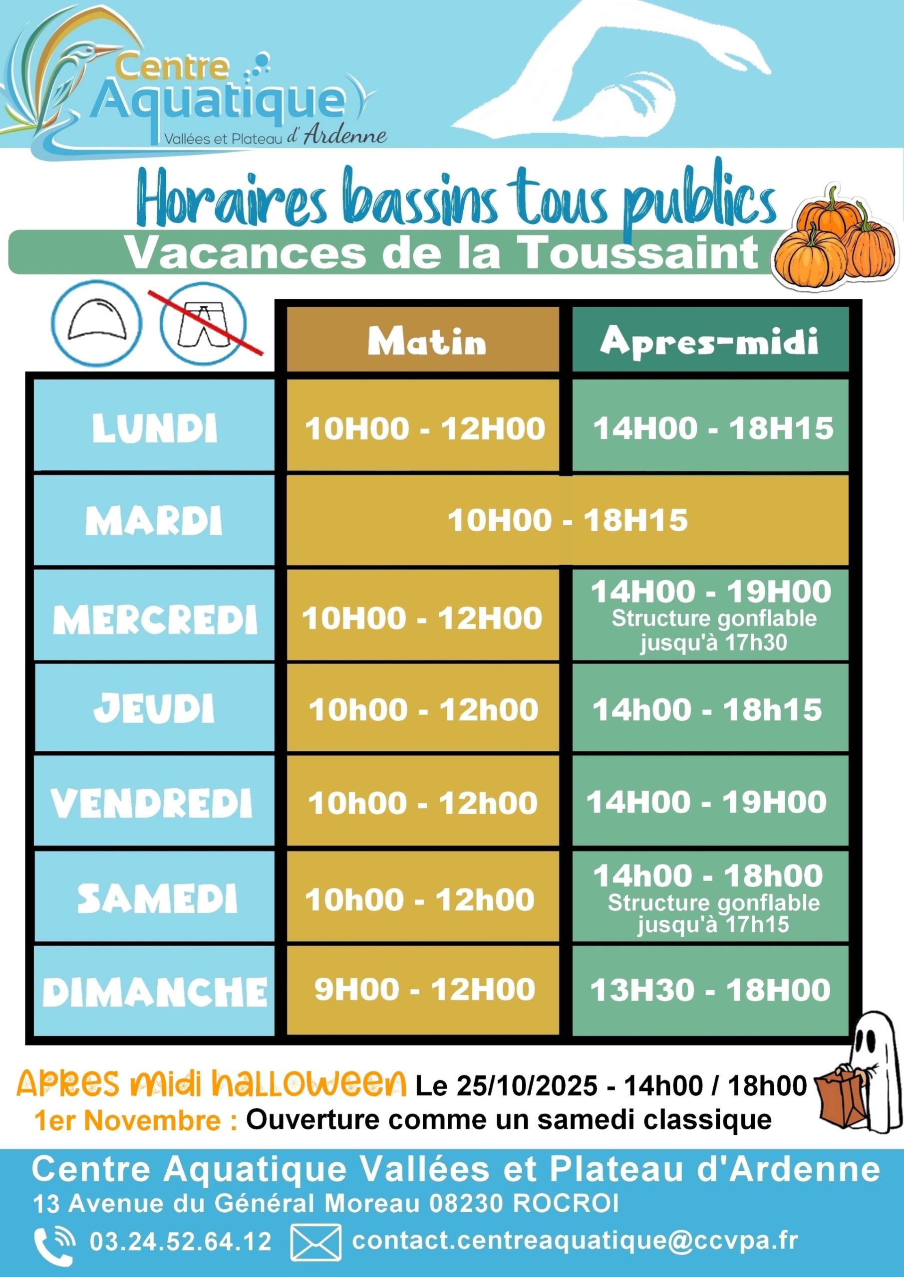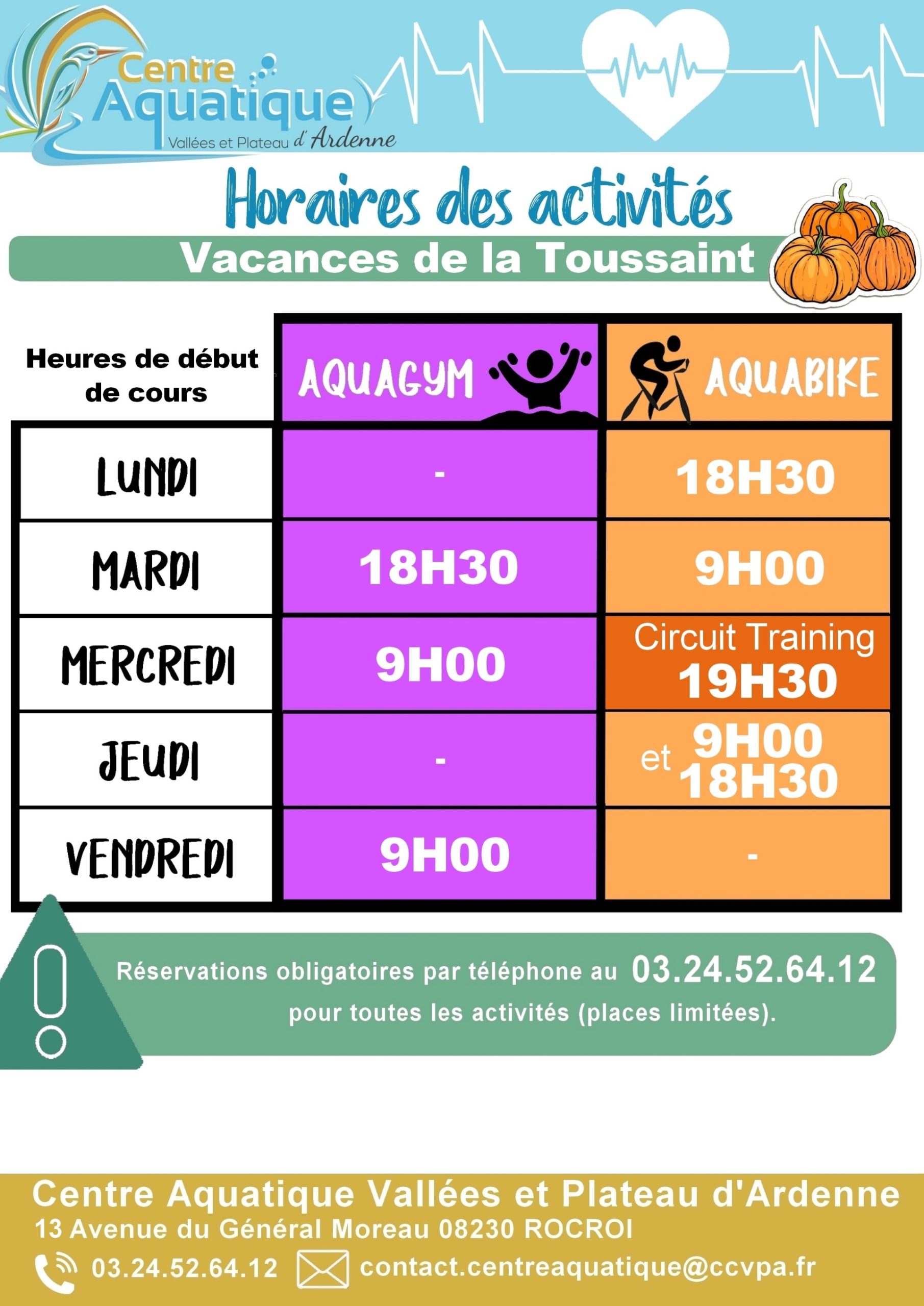 Les activités se poursuivent en horaires adaptés pendant les 🍃𝙑𝙖𝙘𝙖𝙣𝙘𝙚𝙨 𝙙𝙚 𝙡𝙖 𝙏𝙤𝙪𝙨𝙨𝙖𝙞𝙣𝙩🎃 (du 20/10 au 2/11). Vous pouvez d’ores et déjà réserver vos séances 𝕕’𝕒𝕢𝕦𝕒𝕘𝕪𝕞, 𝕒𝕢𝕦𝕒𝕓𝕚𝕜𝕖 𝕖𝕥 𝕔𝕚𝕣𝕔𝕦𝕚𝕥 𝕥𝕣𝕒𝕚𝕟𝕚𝕟𝕘 : 👉 ☎️en nous appelant au 03.24.52.64.12 🖱🟢en cliquant sur le bouton vert » Réservez une activité »