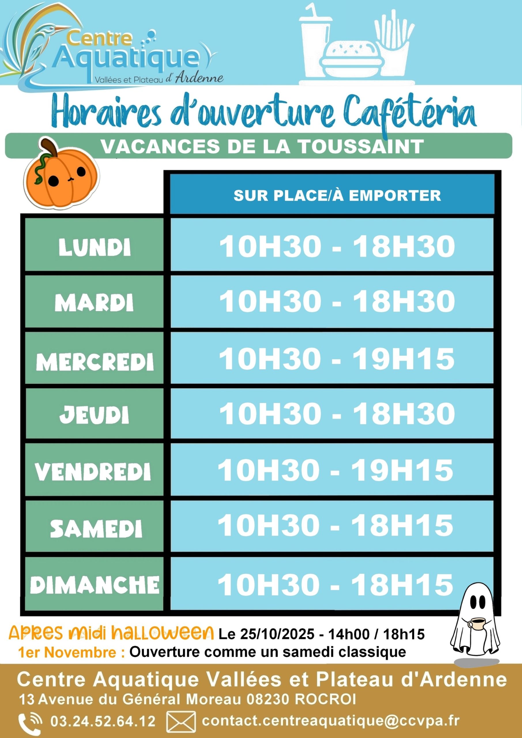 Horaires d’ouverture de ☕l’espace Cafétéria🍔 pendant les Vacances de la TOUSSAINT (du 20/10 au 02/11 inclus).