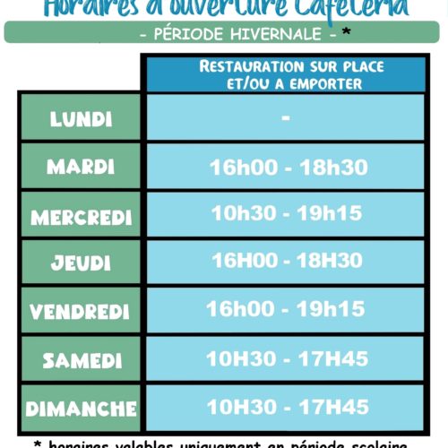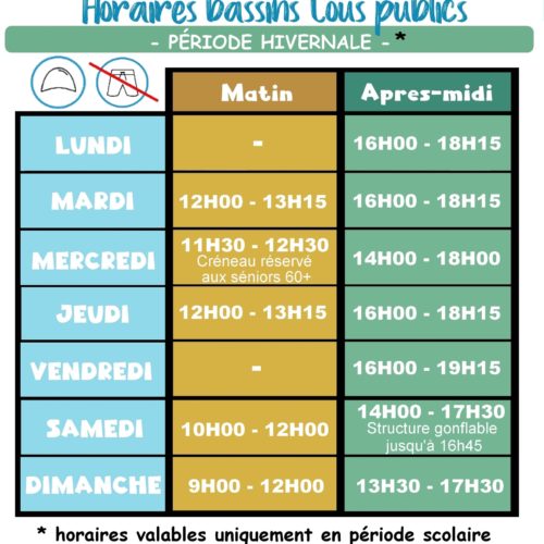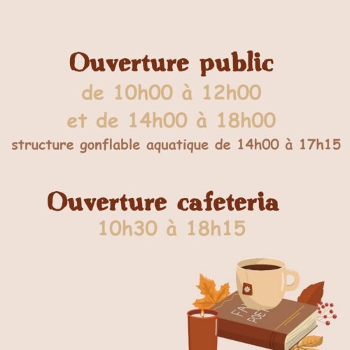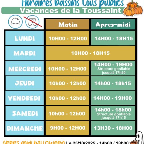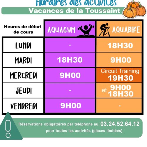 Evenements & actualités Horaires d’ouverture au Public, période des Vacances de la 🍂🍁TOUSSAINT🎃👻 du 20 octobre au 2 novembre inclus 17 octobre 2025 Read More Les activités se poursuivent en horaires adaptés pendant les 🍃𝙑𝙖𝙘𝙖𝙣𝙘𝙚𝙨 𝙙𝙚 𝙡𝙖 𝙏𝙤𝙪𝙨𝙨𝙖𝙞𝙣𝙩🎃 (du 20/10 au 2/11). Vous pouvez d’ores et déjà réserver vos séances 𝕕’𝕒𝕢𝕦𝕒𝕘𝕪𝕞, 𝕒𝕢𝕦𝕒𝕓𝕚𝕜𝕖 𝕖𝕥 𝕔𝕚𝕣𝕔𝕦𝕚𝕥 𝕥𝕣𝕒𝕚𝕟𝕚𝕟𝕘 : 👉 ☎️en nous appelant au 03.24.52.64.12 🖱🟢en cliquant sur le bouton vert » Réservez une activité » 17 octobre 2025 Read More Horaires d’ouverture de ☕l’espace Cafétéria🍔 pendant les Vacances de la TOUSSAINT (du 20/10 au 02/11 inclus). 17 octobre 2025 Read More 🎃Samedi 25 octobre🧙 : après-midi HALLOWEEN de 14h00 à 18h00 ! Structure gonflable , animations et présence de Tanou des Loulous (🎈sculpture sur ballons – 🎨maquillage de 15h30 à 18h00),🍬 bar à bonbons terrifiants👻 à la Cafétéria … 16 octobre 2025 Read More Horaires d’ouverture au 🏊🏼♀️public🤽 période scolaire (France – zone B) 8 septembre 2025 Read More Horaires des activités 🚴🏼♀️💦aquasports🏋🏽💦 (aquabike, aquagym et circuit training) en période scolaire (France – zone B) 8 septembre 2025 Read More Horaires espace 🍴Cafétéria☕ en période scolaire (France – zone B) 8 septembre 2025 Read More